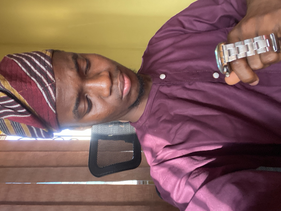 A close-up shot features a man wearing a maroon shirt with decorative buttons and a traditional striped cap. He holds up his left hand to display a silver wristwatch. The background includes drawn blinds and a yellow wall. He is positioned at a slight angle to the camera, with his face partially visible, conveying a relaxed or contemplative expression.