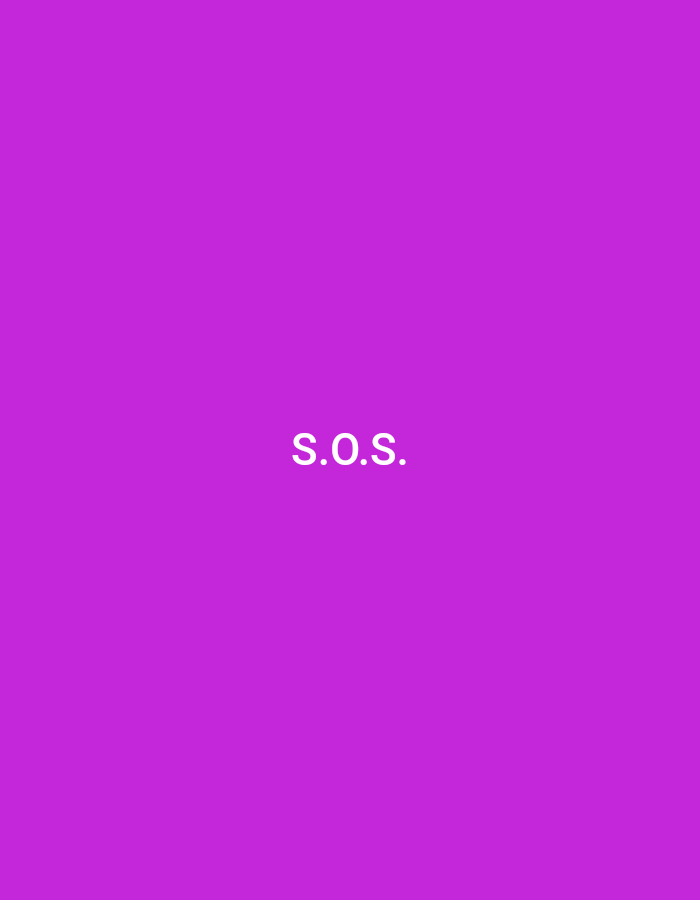 The scene depicts white, sans-serif text "S.O.S." with periods, centrally positioned on a solid magenta background. No individuals, objects, actions, or interactions are visible within the image. The location is the city of Unknown, Unknown.