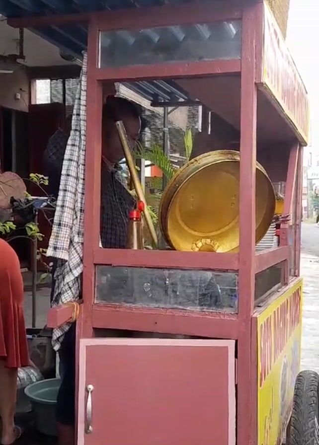 A man stands inside a food cart. The cart has a maroon-colored base, a wooden frame, and a corrugated metal roof. The cart has shelves containing items, including a large gold-colored dish. The man is holding a long metal rod. A person in an orange skirt stands beside the cart. The cart is parked on a street. A truck passes in the background.