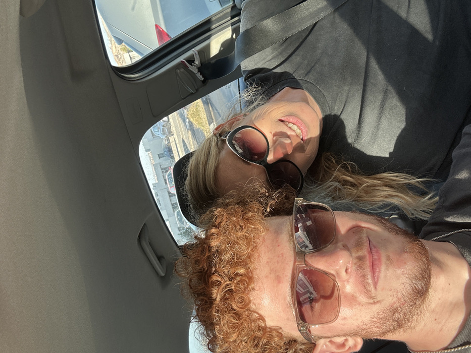 An adult male and an adult female are depicted in a close-up photograph taken inside a vehicle in Rosh HaAyin, Israel. The male, positioned on the left, has reddish-brown curly hair, a beard, and wears clear-framed sunglasses, displaying a slight smile. A silver chain is visible around his neck. The female, positioned to the right and slightly behind, has blonde, wavy hair and wears black cat-eye sunglasses, exhibiting a smile. Both subjects are looking directly at the camera. The vehicle interior shows a light-colored headliner and a seatbelt on the right side. Through the windows, an outdoor environment is visible, featuring a roadway or parking lot with multiple vehicles, distant low-rise buildings, and sparse dry ground cover, under bright, direct sunlight originating from the right side of the frame.