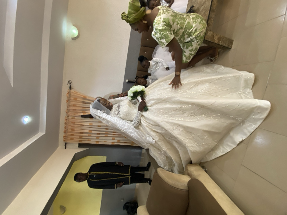 The scene depicts an indoor gathering, identified by the user as being in Jos, Nigeria, likely associated with a wedding event. **Environment:** The setting is a room with light cream-colored walls, a section of gray wall, and a patch of greenish-yellow paint visible on the upper left. The ceiling is a modern false ceiling with two visible recessed circular lights. The floor is covered with light-colored tiles. A light brown armchair or sofa is partially visible on the bottom left. Sheer, patterned curtains hang on the left wall from a dark rod. A dark architectural support beam is present near the curtains. A wall-mounted light fixture emitting a green glow is on the right wall. A dark, reflective coffee table or bench is positioned on the right. **People:** Seven individuals are visible. 1. **Central Figure (Bride):** A woman of African descent stands centrally, adorned in an elaborate off-white/cream wedding gown with long sleeves, a high neckline, and extensive sparkling embellishments. She wears a white veil draped over her head and shoulders, and holds a white floral bouquet with green accents in her left hand. Her expression is a soft smile, looking downwards and to her right. 2. **Man:** An adult male of African descent stands in the left background, facing slightly right. He wears a black long-sleeved tunic with gold embroidery on the collar, placket, and cuffs, paired with dark trousers and shoes. 3. **Woman (Foreground Right):** An adult female of African descent is seated on the dark table/bench on the right, facing the bride. She wears a short-sleeved, knee-length dress patterned in green and white, and a green headwrap (gele). Her left hand rests on the fabric of the bride's dress. 4. **Children:** Three or four young girls, presumably flower girls, are positioned in the mid-background to the right of the bride. They are dressed in white formal dresses, some with shimmering tops and voluminous skirts. One child is clearly visible looking towards the bride, while others are partially obscured. **Actions and Interactions:** The bride is standing, holding her bouquet, and appears to be smiling. The seated woman in the green dress is interacting with the bride by placing her hand on the voluminous skirt of the wedding gown. The man and children observe the interaction.
