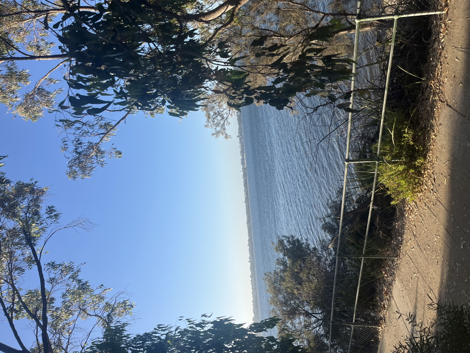 A daytime image taken in Applecross, Australia, depicts a view overlooking a body of water. The immediate foreground shows a light-colored unpaved path covered with scattered dry leaves and patches of green vegetation. A dark-colored metal railing fence, consisting of horizontal bars and vertical posts, runs along the edge of the path, demarcating a slope descending towards the water. Behind the fence, dense green shrubs and smaller trees populate the embankment. The mid-ground is occupied by a wide expanse of calm, blue water with subtle surface ripples. A distant landmass is visible on the far horizon, featuring a low-rise skyline of buildings and a line of vegetation. The upper portion of the frame reveals a clear, bright blue sky, partially obscured and framed by the dark green foliage and branches of several large trees, consistent with eucalyptus species, positioned at the left, top, and right edges of the view. No human subjects or animals are visible. The scene is illuminated by direct sunlight, casting some shadows on the path.