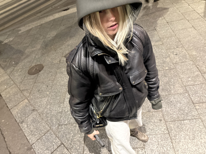A high-angle shot reveals a person wearing a gray bucket hat and a heavy black leather jacket with multiple pockets and padded shoulders