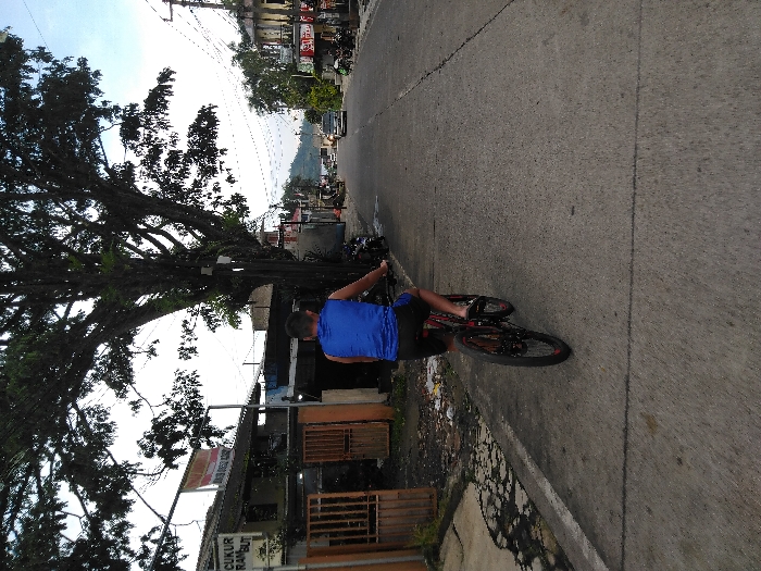 The image depicts an urban street scene. A male individual is cycling away from the viewer on a paved road, wearing a blue sleeveless top and dark shorts, with bare feet on the pedals of a red and black mountain bike. To the left, a large tree with extensive foliage stands prominently beside the road. Behind the tree and to the left, a building with a brown metal gate is visible, displaying a white sign with red text that reads "CUKUR RAMBUT" and "WANITA DEWASA CUKUP," which is Indonesian/Malay. This scene is identified as being in the city of Sintgaing, Myanmar, although the visible signage is in Indonesian/Malay. The road, which has a faint centerline, extends into the distance, flanked by various buildings on both sides. Utility poles with numerous overhead power lines are present along the street. On the right side of the road, several motorbikes are parked, and a silver car is visible further down the street. Distant hills or mountains are discernible against a bright, hazy sky. The lighting conditions suggest either early morning or late afternoon.