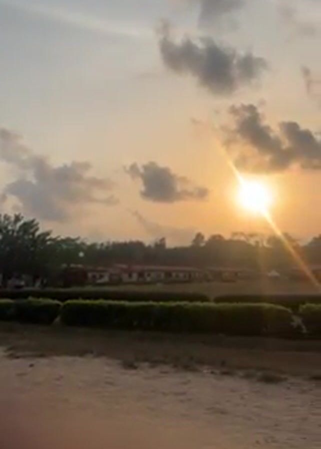 sunset over a landscape. The sun is visible through the clouds, creating a bright light and long rays. Below the sun is a line of trees and buildings. In the foreground, there is a grassy area and a row of trimmed bushes. Several people walk by in the background.