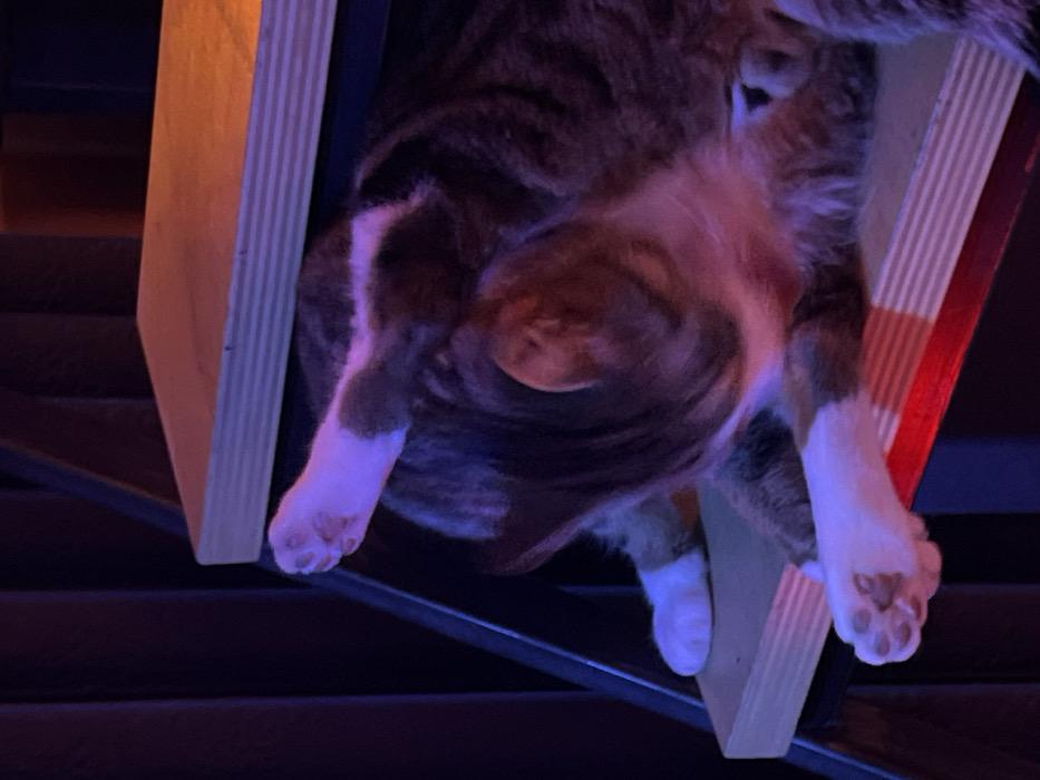 - "A close-up shot shows a cat lying upside down in a wooden structure, possibly a chair or cat tree" by FM-iR7bg1, licensed under CC BY 4.0