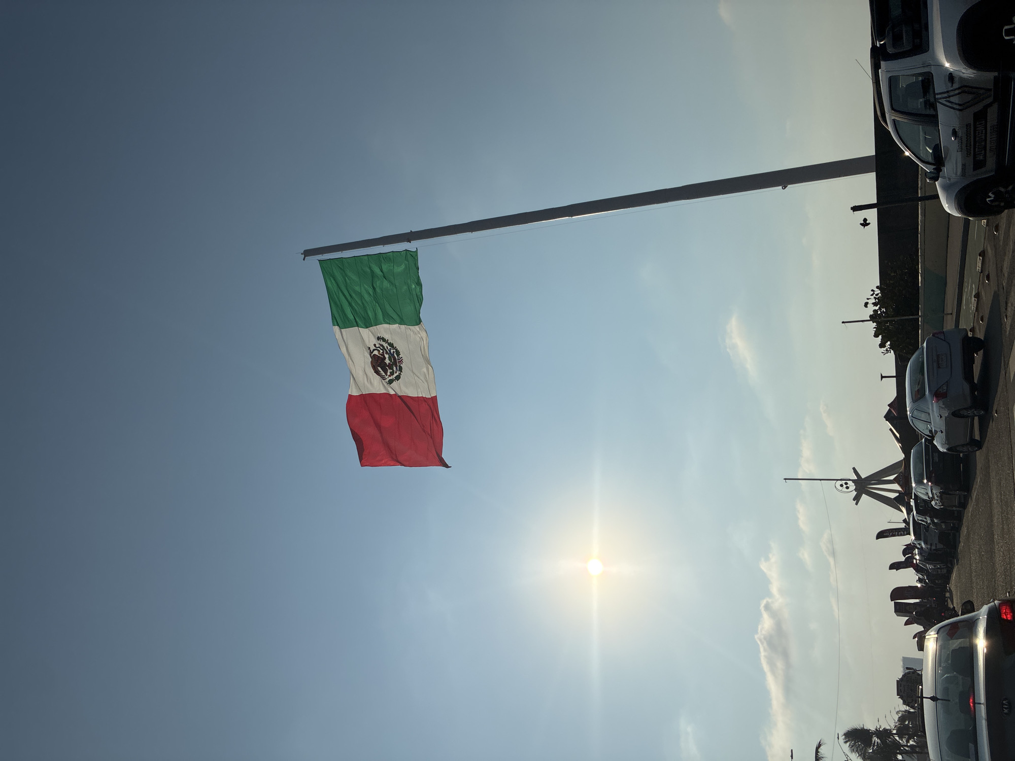 The image presents an outdoor scene on a clear, bright day under a light blue sky with scattered clouds. A prominent Mexican national flag, featuring vertical red, white, and green stripes with the national coat of arms centered on the white stripe, is flying from a tall, light-colored flagpole in the upper right quadrant, extending beyond the frame's top edge. The sun, emitting a bright flare, is positioned in the upper left quadrant. In the foreground, a multi-lane paved road is occupied by a queue of vehicles. The rear of a dark-colored Kia sedan is partially visible on the bottom left, positioned in a lane of traffic. To the right, the side and rear of a white Renault Alaskan pickup truck are visible, displaying "RENAULT" and "AUTOVENT" branding. Along the midground, separated from the road by a low barrier or wall, lies a promenade or coastal walkway. This area features a distinctive, large, dark-colored monument, identifiable as the Quetzalcoatl Monument, characterized by a tripod-like base supporting a central vertical element topped by a circular form. Alongside the monument and extending into the background are multiple dark, banner-like structures and what appear to be temporary stalls, interspersed with palm trees. A body of water is visible on the far left horizon beyond these structures. The location is the Malecón Costero in Coatzacoalcos, Veracruz, Mexico.