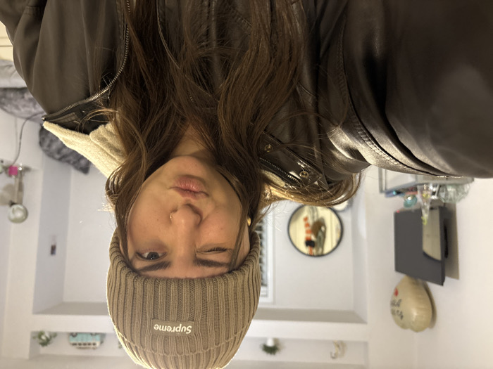 A young woman with long brown hair is wearing a brown leather jacket with a beige beanie with the word "Supreme" stitched on it. She is facing the camera with one eye closed. The background includes a small round mirror, a gray and white patterned bedspread, and a white wall with decorations. The photo is taken from a low angle and appears to be upside down.