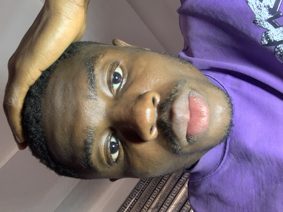 A close-up portrait depicts an adult male with dark skin, short dark hair, and a mustache with a light beard. His dark eyes are open and looking directly forward, and his lips are slightly parted. His right hand, with dark skin, is placed on the top of his head, fingers slightly spread. He is wearing a purple long-sleeved shirt or sweatshirt, with a partial white and black graphic design visible on the lower right. The background on the left features a repeating geometric pattern, possibly a Greek key design, in light and dark tones. The upper right background is uniformly light-colored. The image does not contain any identifiable landmarks or features to determine a specific location within Jos, Nigeria.