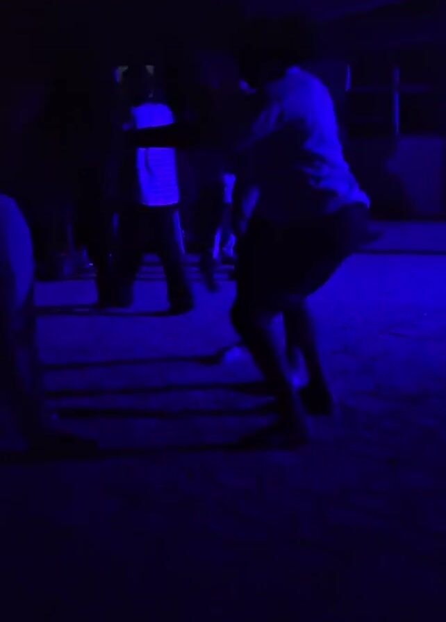 several people dancing on a paved area under changing colored lights. Some of the people are just silhouettes, but those closer to the camera are more defined. They are wearing what appear to be shorts and t-shirts and are barefoot. There is a building in the background with a window and a door visible. There are also chairs placed along the back of the paved area. The lights change between green, red, purple and blue.