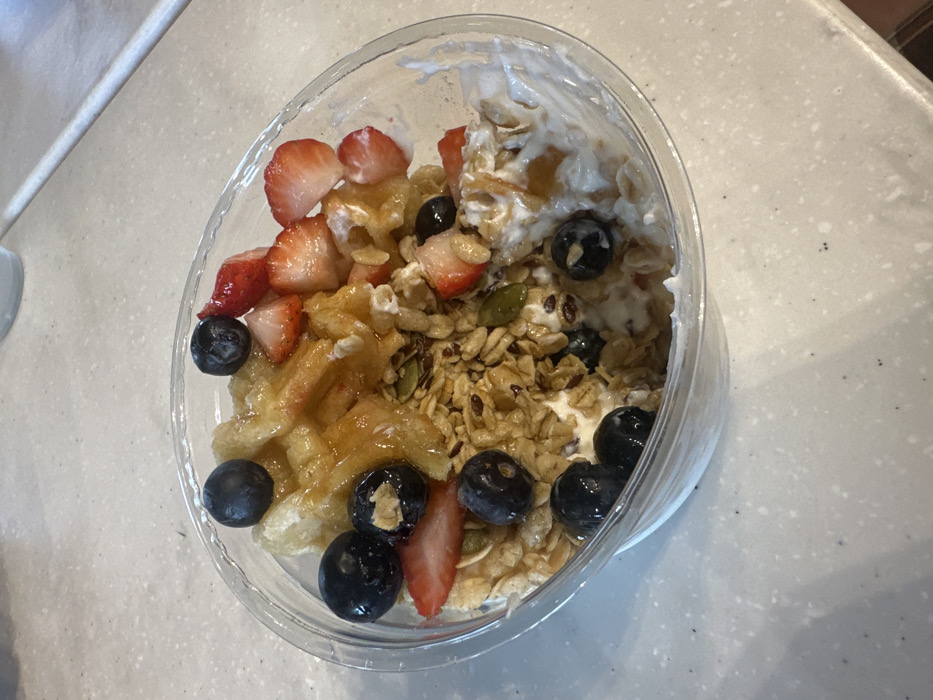 - "The image displays a clear plastic bowl containing a food item, likely a yogurt or fruit parfait, positioned on a light-colored, speckled countertop" by FM-REIZd2, licensed under CC BY 4.0