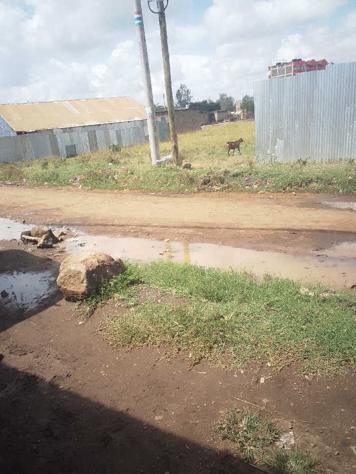 This image depicts an outdoor scene in Juja, Kenya, characterized by an unpaved dirt road and undeveloped land under a partly cloudy sky. In the foreground, dark brown dirt occupies the lower portion of the frame, interspersed with patches of green grass. A large, irregularly shaped brown rock rests on the left, bordering a shallow, murky puddle of water. Further along the road to the right, additional puddles are visible. The midground features a wide, light brown dirt road exhibiting ruts and several water-filled depressions. To the left of the road, a structure with a corrugated iron roof and walls is partially visible, behind what appears to be a corrugated iron perimeter fence. Two utility poles stand upright between the dirt road and an open field: a thick, light-colored concrete pole with horizontal colored bands (blue, white, green, red) at its upper section, and a thinner, darker wooden pole adjacent to it. A brown goat is positioned in the open field to the right of the utility poles, facing towards the right side of the frame. This field consists primarily of dry grass and exposed dirt. In the far right midground, a tall corrugated iron fence delineates the boundary of the field. The background shows scattered low-rise structures and sparse vegetation. In the upper right corner, a multi-story building with reddish elements on its exterior is partially visible, rising above the corrugated iron fence. The sky is predominantly covered by white and grey clouds, indicating daylight conditions. No people are present in the scene.