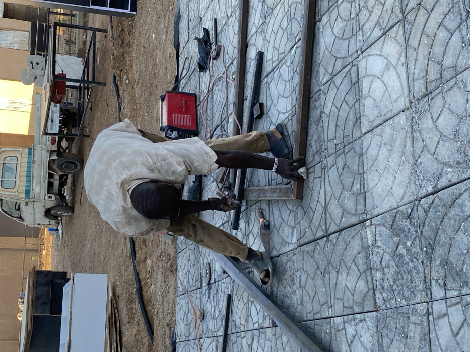 A dark-skinned man is welding metal on a patterned stone surface outdoors. He wears a light-colored shirt, trousers, and sandals. A red welding machine sits nearby with its wires extending towards him. Various metal pieces are scattered around. A small truck with a flatbed is parked behind him, along with some furniture or structures being assembled. The ground around the workspace appears to be a mixture of dirt and gravel.
