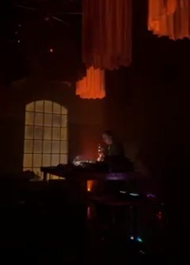 A man DJs in a dimly lit room with red lighting, with decorative fabric chandeliers and hanging star shapes overhead. He stands at a table with equipment, adjusting the controls. Behind him is a large arched window. There are other tables with equipment nearby. The video has a dark and grainy quality.