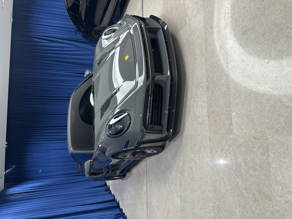 The scene depicts an indoor display area in Tashkent, Uzbekistan. A dark grey, widebody Porsche sports car is prominently positioned in the center, angled towards the left. The vehicle features a large front splitter, hood vents, extended fender flares, dark multi-spoke wheels, and a significant rear spoiler. A yellow Porsche crest is visible on the front hood. Partially visible on the right is the rear quarter of a second, black vehicle with dark wheels. The backdrop consists of a full-height, dark blue curtain. The floor is composed of large, light grey, polished tiled sections that reflect overhead lighting. Two small, white ceiling-mounted devices are visible against the white ceiling.