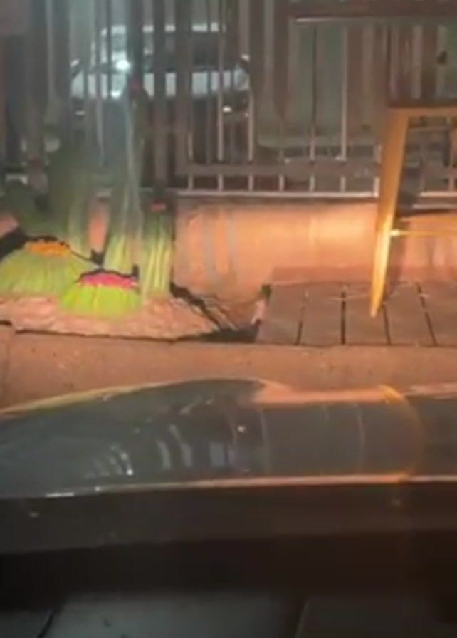 rat standing on its hind legs on a walkway. The rat is white or light-colored and appears to be looking around. The walkway is made of wooden planks and is surrounded by a concrete wall. There are some plants and decorations nearby. The video is taken from inside a car, looking out the windshield. The overall environment appears to be an outdoor area, possibly near a building or restaurant.