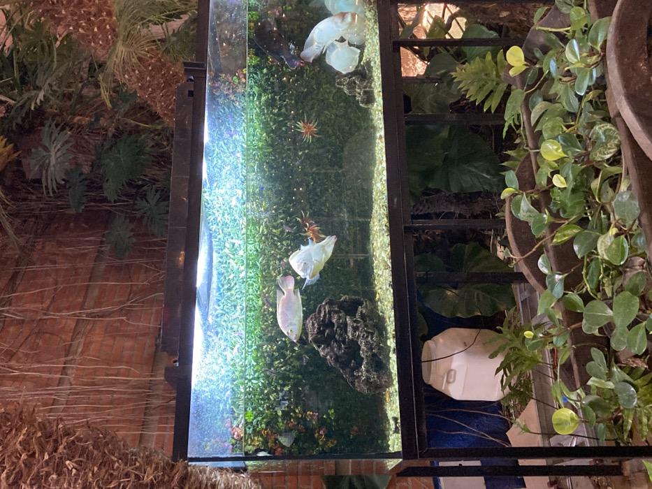 A tall, rectangular aquarium stands indoors, teeming with lush greenery. Several fish, including a silver arowana, swim amidst the vibrant aquatic plants. A dark rock formation adds depth to the aquatic landscape. The aquarium is framed by a dark metal stand, with various foliage surrounding it. A brick wall and more plants are nearby, creating a natural, indoor oasis. A white plastic jug sits on the lower shelf of the aquarium stand.