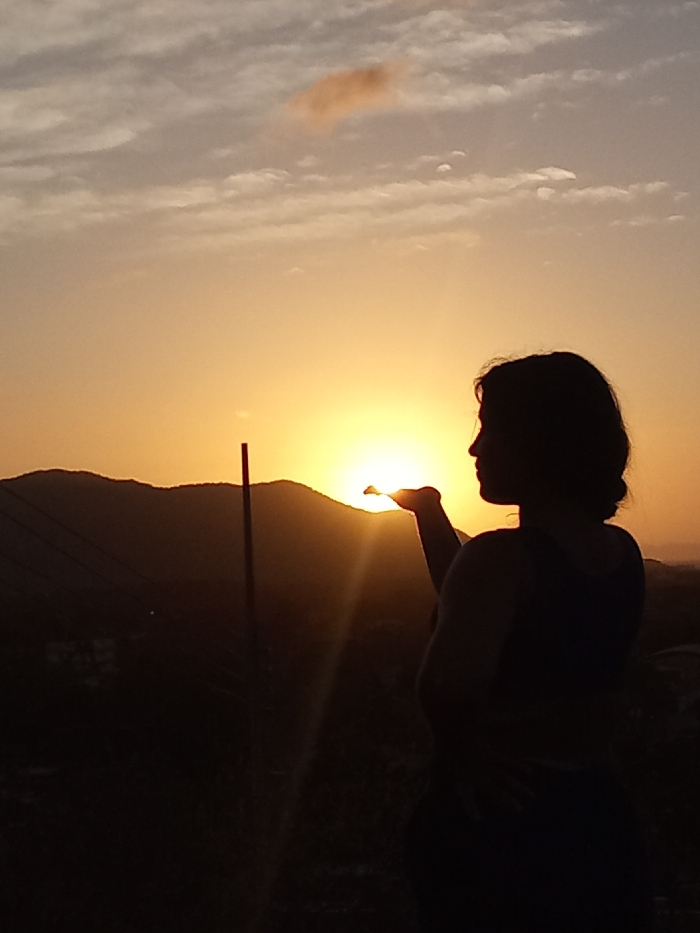 The image captures an outdoor scene at sunset in Juan Griego, Venezuela. A single individual, silhouetted against a brilliant orange-yellow sun, stands in profile facing right. The person's right hand is cupped upwards, positioned to appear as if holding the setting sun. The sun is partially obscured by a dark, undulating range of mountains that form the horizon. Below the mountains, faint architectural outlines suggest a populated area. A tall, slender dark pole is visible to the left of the individual. The sky above transitions from intense orange-yellow near the horizon to lighter orange and blue-grey, with scattered, wispy clouds and a distinct reddish-brown cloud formation in the upper left. Sunlight casts visible rays originating from the sun.