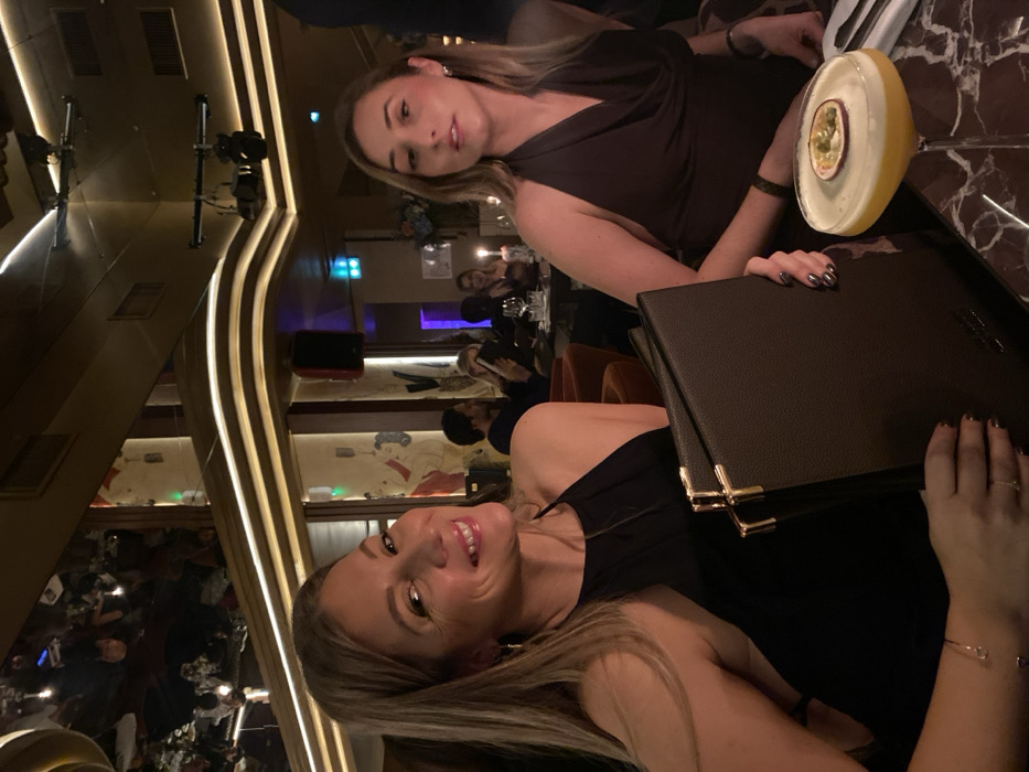 This image depicts an interior scene at Buddha-Bar Paris, located at 8/12 Rue Boissy d'Anglas, 75008 Paris, France. Two Caucasian women are seated at a table in the foreground, illuminated by dim, warm lighting. The woman on the left, with long light brown hair, faces the camera directly and smiles. She wears a black halter-neck top and holds two dark brown leather-bound menus with gold corner protectors in her hands. Her left hand displays a ring on the ring finger and a thin bracelet. The woman on the right, also with long light brown hair, looks to her right, away from the camera. She wears a dark brown top with a cowl or draped neckline. On the dark marble-patterned table in front of her is a cocktail glass containing a yellow liquid with a white foam top, garnished with a slice of passion fruit. The background shows a dimly lit, upscale bar or restaurant environment with other patrons seated at tables. Decorative elements include wall murals depicting stylized Asian figures, dark sound speakers, and an elaborate ceiling featuring golden horizontal striped panels with embedded lighting and reflective surfaces. A lit candle is visible on a table further in the background. The overall ambiance is sophisticated and atmospheric.