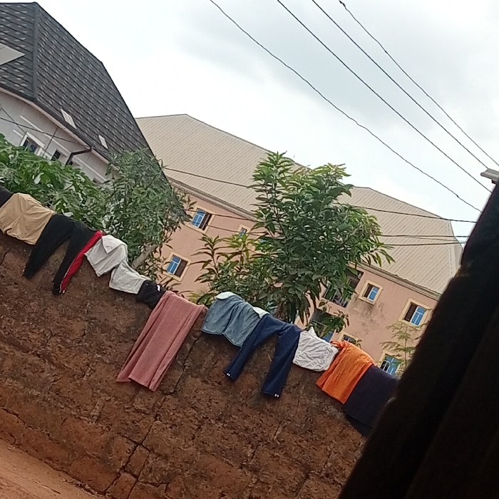 The image depicts an outdoor scene in the city of Unknown, Unknown, primarily focused on a reddish-brown masonry wall in the foreground. Various articles of clothing are draped over the top of this wall, from left to right: a pair of khaki trousers, black trousers, a red garment, a white t-shirt, a black garment, a pink skirt, a light blue shirt, dark blue jeans, a white t-shirt, an orange t-shirt, and a dark blue garment. Behind the wall, green foliage from trees and bushes partially obscures several buildings. In the background, a multi-story building with light peach-colored walls and a light beige hip roof features multiple rectangular windows with blue frames. To the left of this, another multi-story building with light grey walls and a dark grey shingled roof is visible. Overhead, multiple black utility lines traverse the overcast sky. No people are visible.