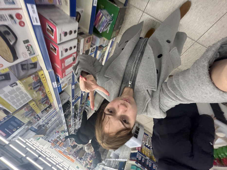 A selfie depicts a woman in a gray coat, making a peace sign while standing in a store aisle. Shelves stocked with various products line the left side of the frame. Other people are visible further down the aisle. The woman is wearing brown shoes and a gray sweater under her coat, which has black buttons. The fluorescent lighting of the store illuminates the scene.