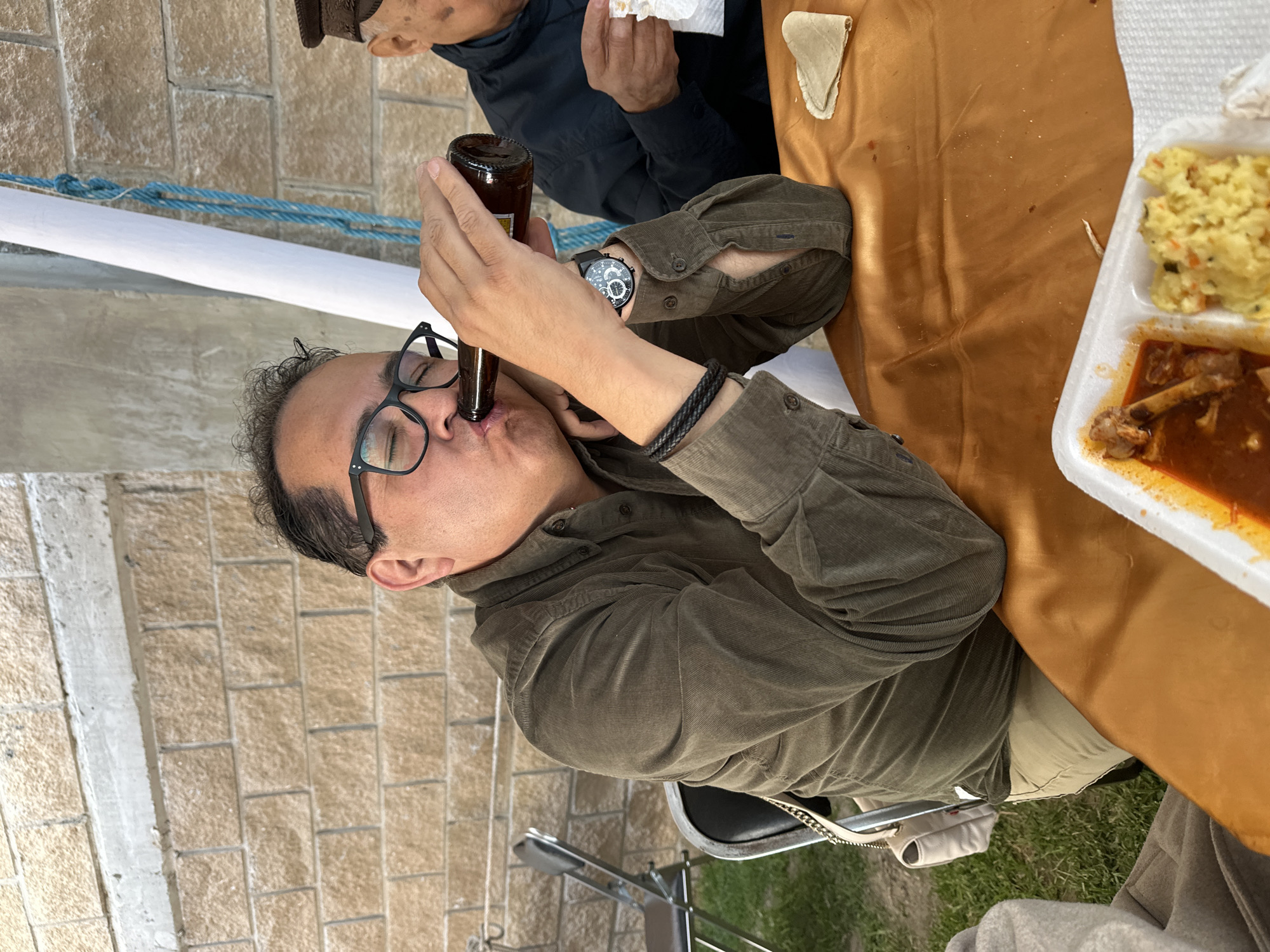 A man with short dark hair and glasses is drinking directly from a brown glass bottle. He is wearing a khaki-colored button-down shirt, light-colored pants, a wristwatch, and a black bracelet. A partial view of another person in a dark jacket and hat is visible above him. Both are seated at a table covered with an orange tablecloth, upon which rests a white styrofoam container holding food, including rice and a stew with bones. A white pipe or beam is visible in the background, along with a light brown brick or stone wall. A metal folding chair is visible under the man drinking. The scene appears to be outdoors during the daytime, possibly under a tent.