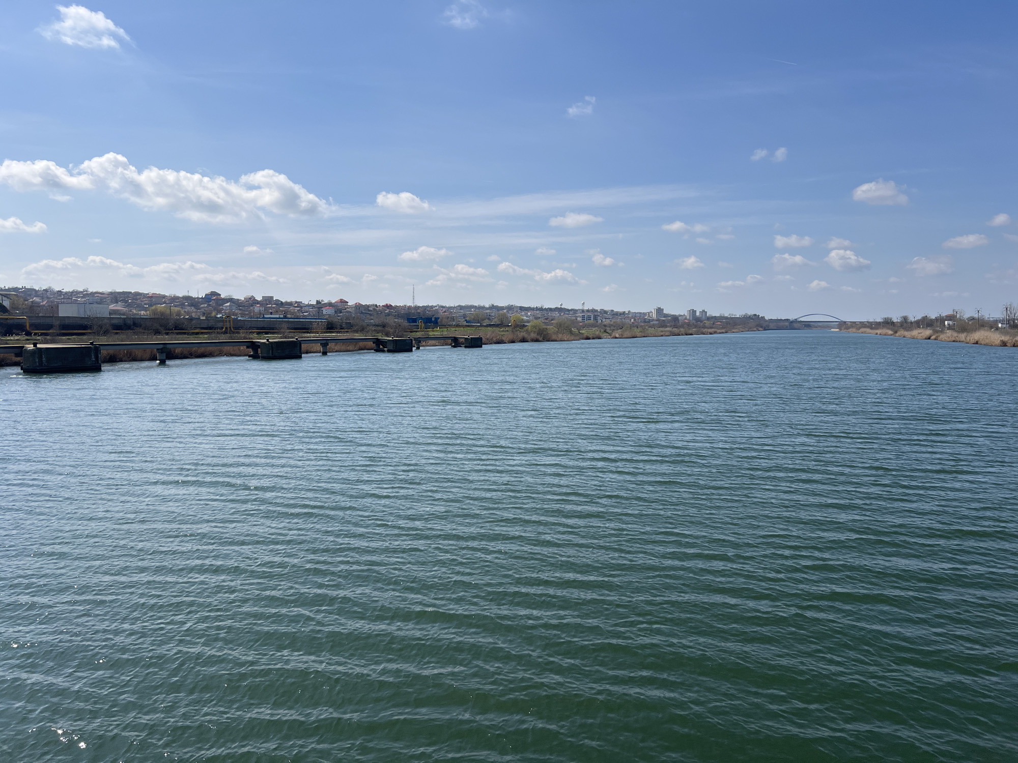 The scene depicts a wide view of the Poarta Albă–Midia–Năvodari Canal in Medgidia, Romania. The foreground consists of dark green-blue water with a rippled surface. A multi-pier concrete structure, consistent with a low-profile bridge or conduit, extends from the left bank, partially over the canal. Both the left and right banks are lined with dry, brown vegetation. The city of Medgidia occupies the distant left and center horizons, characterized by numerous residential buildings with varied roof colors and some industrial structures on elevated terrain. A prominent arch bridge spans the canal in the far distance, slightly right of center. The sky is clear blue with scattered white cumulus clouds; a faint contrail is visible in the upper right quadrant. The environment suggests bright daylight conditions. No human or animal subjects are visible within the frame.