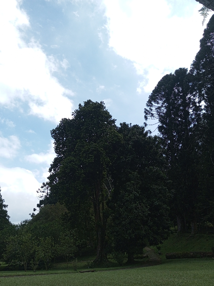 The image displays a natural outdoor scene in Serchhip, India, characterized by extensive vegetation under a partly cloudy sky. The foreground features a uniformly green, manicured grassy area, suggesting a park or landscaped ground. Beyond this lawn, the mid-ground transitions into dense clusters of dark green trees and shrubs, some appearing as younger growth. Several mature, tall trees with thick trunks and full canopies dominate the left and center, while the right side is bordered by very tall, slender trees with darker, possibly needle-like foliage. These trees are situated on an uneven, gently sloping terrain. A large, fallen tree trunk or log is visible horizontally on the grassy incline in the lower right-mid ground. The upper portion of the frame is filled with a bright, light blue sky featuring scattered white cumulus clouds, some brightly illuminated by sunlight. No people, animals, or man-made structures are present within the frame.
