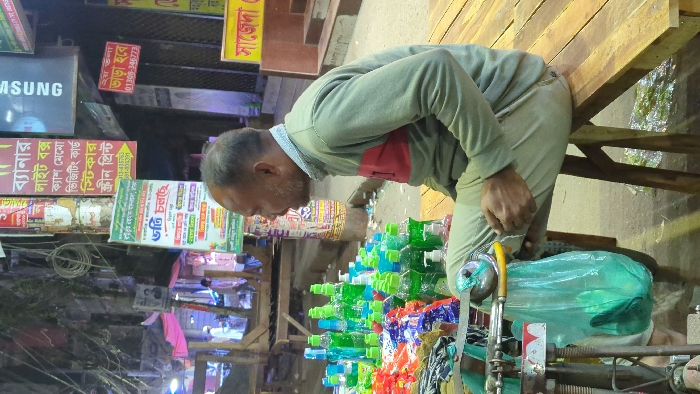 An image shows a man wearing a green sweater and light-colored pants. He is standing by a cart loaded with colorful merchandise. The man appears to be examining or arranging the items on the cart. Behind the cart, there's a busy street scene with various signs in Bangla, including those for "Samsung," "Banner, Light Box, Cash Memo," "Visiting Card, Sticker, Screen Print," and a rental notice. The general ambiance suggests an urban street setting.