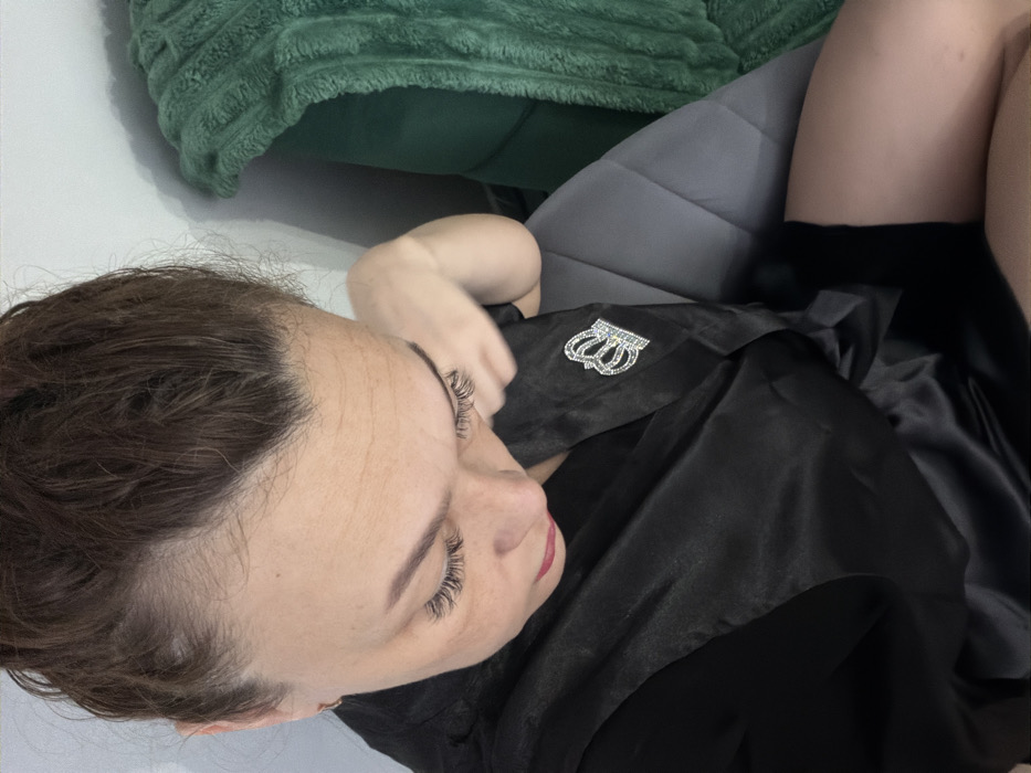 A woman lies reclined on a gray surface, possibly a couch or bed, with a green textured cushion or throw in the background. She is wearing a black satin robe adorned with a decorative, jeweled crown embellishment. Her face is visible, showcasing defined eyelashes and red lipstick. The shot appears to be taken from an overhead angle, focusing on the woman’s relaxed posture and the details of her attire.