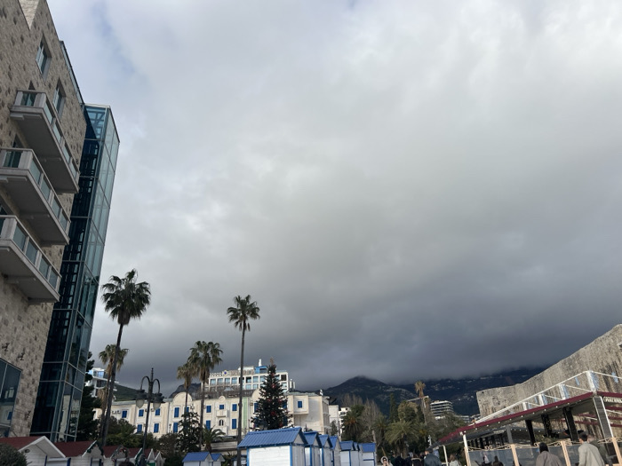 The image depicts a cloudy daytime scene in Budva, Montenegro. The sky is largely overcast, transitioning from light grey on the left to dark, heavy grey clouds on the right, obscuring the upper portions of distant mountains. On the left, a multi-story building with a textured stone facade features several balconies with glass railings. An external, prominent glass elevator shaft is affixed to its right side. Below this building, along the ground level, numerous small, brightly colored structures resembling beach huts or kiosks (white with blue or red roofs) are lined up. In the mid-ground, several tall palm trees are interspersed among other buildings. One multi-story building with light-colored walls and blue window shutters is visible. A large, decorated Christmas tree stands near the center of the frame, to the right of this building. Further back, mountainous terrain is visible, with peaks partially enveloped by clouds. On the right side of the image, a robust structure, possibly part of a beach bar or restaurant, is visible. It features a solid, light-colored base or wall and an exposed framework of beams, with a portion of a red awning still attached. Several indistinct human figures are present around this structure and among the beach huts, appearing to be walking or standing. The overall impression is an urban coastal environment under a heavily clouded sky.