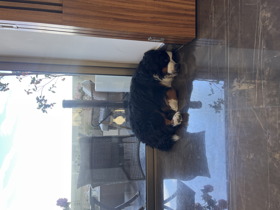 - "A Bernese Mountain Dog rests curled on a polished tile floor indoors, near a glass door" by FM-SikrH3, licensed under CC BY 4.0