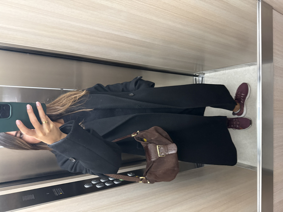A solo individual is depicted in a mirror selfie taken inside an elevator, located in the city of Madrid, Spain. The subject, a person with long brown hair, is wearing a long black overcoat over a dark top, with maroon athletic shoes visible on their feet. A brown suede shoulder bag with a crocodile-textured flap and a gold-colored buckle is slung over their left shoulder. A gold-colored ring is present on the ring finger of the left hand, which holds a dark green-cased smartphone, partially obscuring the subject's face. The elevator interior features light wood-paneled walls, a light-colored floor, and a metal-framed mirror or reflective surface forming the background. An elevator control panel with silver buttons and a digital display is visible on the left wall.