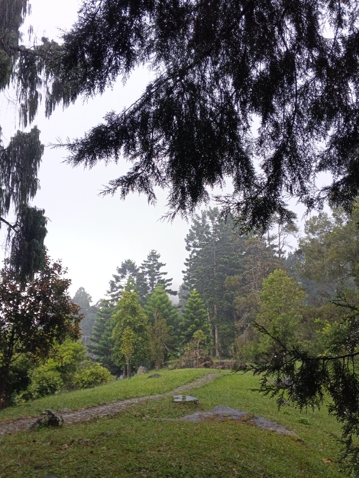 A misty forest scene with various trees is framed by dark branches overhead and to the side. A grassy foreground with a worn stone path leads toward the densely forested area. The trees include a mix of evergreens and deciduous varieties in shades of green and brown. The sky is overcast, contributing to the overall atmosphere of dampness and tranquility.