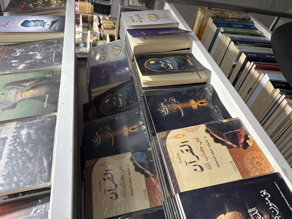 shelf filled with books, predominantly in Arabic. Several titles are visible, including "What He Doesn't Sell," "Commencing In It," "The Marriage of Ignorance," and "The Quran: A Word in God's Book" by Dr. Ahmed Omar Al-Nima. Other author names are mentioned, like Abdul Rahman Muhammad and Tima Salem. Some books are wrapped in plastic. There are various editions of "The Quran" books stacked on top of each other.