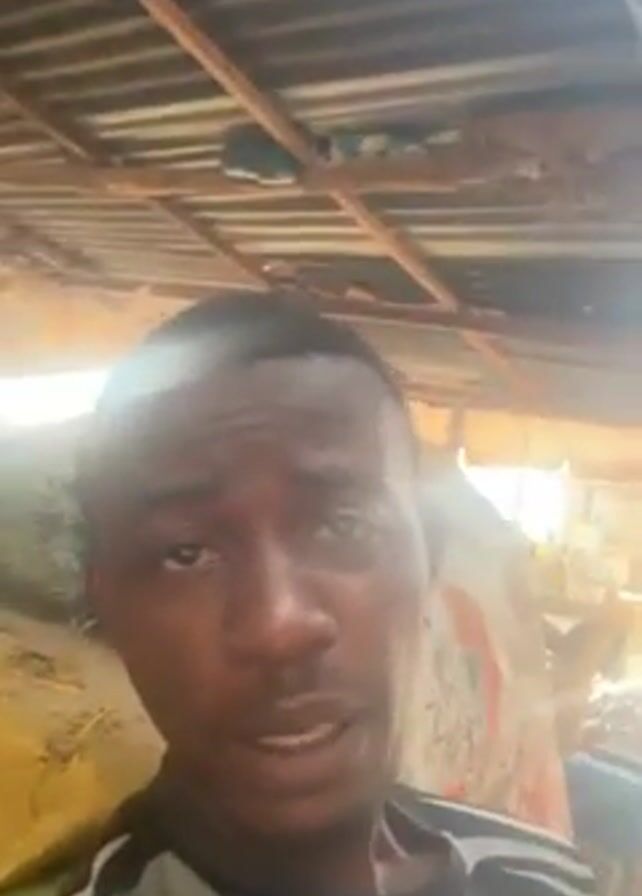 A close-up shot shows a man sitting under a corrugated metal roof structure. The man is wearing a black shirt with an Adidas logo. He is looking directly at the camera and speaking. The light is bright, causing some glare. Behind him, there is a blurry background with what appears to be sacks and other objects. The camera seems to be hand-held, as there is some movement. The outdoor environment is visible in the background.