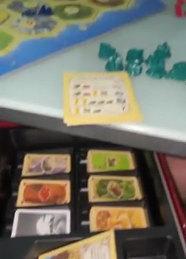 group of people playing the board game Settlers of Catan. The game board is visible with hexagonal tiles representing different resources. Players have placed their settlements and roads on the board. Game pieces, including resource cards and development cards, are organized in the game box. The players are seated around the table, with one woman visible as she reaches for game pieces. The overall setting is casual, suggesting a friendly game session.