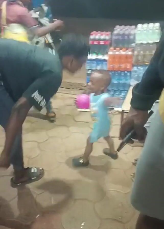 young child, likely a toddler, playing with a pink ball in an outdoor setting. The child, wearing a light blue outfit and dark shoes, is initially standing near an adult in a dark shirt. The adult seems to touch the child's forehead briefly. The child then walks away, holding the ball. They look directly at the camera, smile, and raise the ball. There are several adults around, some visible in the background. A variety of beverages (water and soda) are stacked on a table nearby. A motorcycle is parked in the background. The ground has a patterned tile surface. The scene appears to be at night, with artificial lighting.
