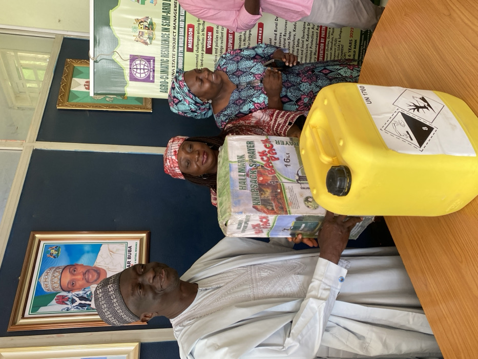 An indoor scene within an office or project facility in Unguwar Rimi, Kaduna, Nigeria, depicts four individuals. A man on the left, dressed in a light-colored traditional Nigerian kaftan and cap, smiles broadly while holding a rectangular cardboard box labeled "HALLMARK KNAPSACK SPRAYER BACK PACK 16 Ltr SPRAYER." To his right, two women are also smiling; one wears a red and white patterned headwrap and top, and the other wears a blue and green patterned headwrap and dress. A fourth individual, partially visible on the far right, is wearing a pink shirt. In the immediate foreground, on a wooden table, rests a yellow plastic jerrycan with a black screw cap. A white label on the jerrycan displays the text "UN 1760" and includes two black hazard pictograms: one indicating corrosive materials (a hand and surface being corroded) and another for environmental hazards (a dead tree and fish). The background features a dark blue wall. On the left, a framed portrait of a man identified as "ABUBAKAR BUBA" is visible, along with the Nigerian coat of arms. To the right, a large green banner is displayed, featuring "WORLD BANK" and "KADUNA STATE PROJECT MANAGEMENT UNIT" logos and text advertising "AGRO-CLIMATIC RESILIENCE IN SEMI-ARID D..." and detailing a "MISSION" and "VISION." The lighting is bright, and the overall interaction suggests a formal presentation or distribution event.