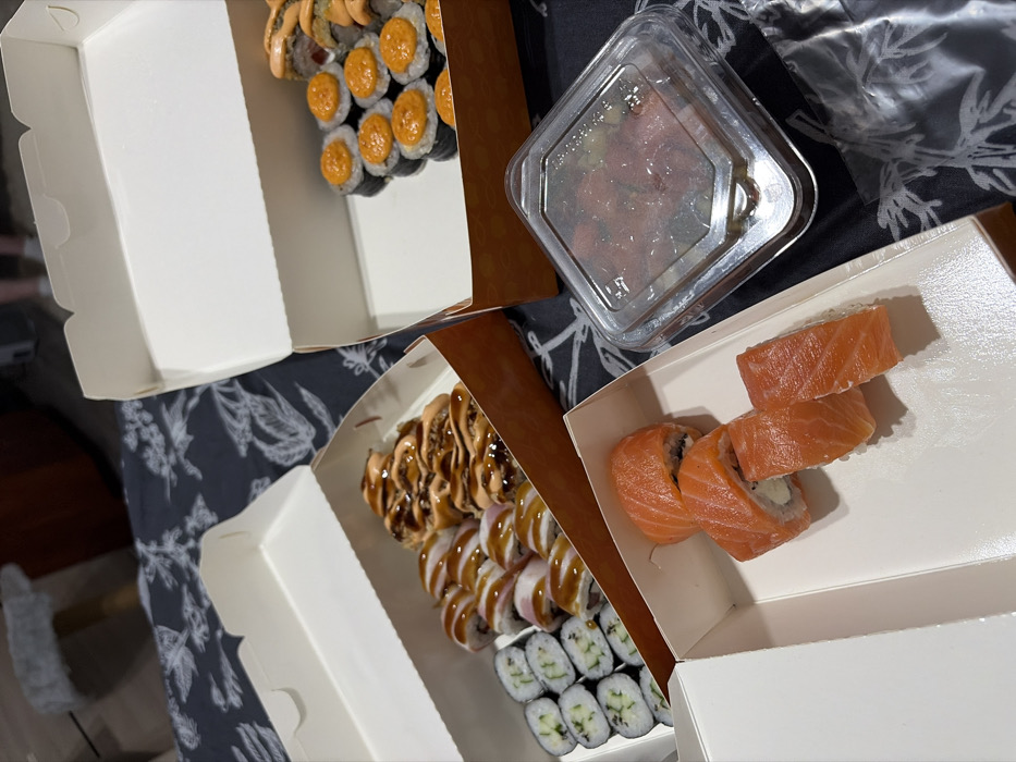 - "A collection of sushi boxes sit on a patterned surface" by FM-rbhEP2, licensed under CC BY 4.0