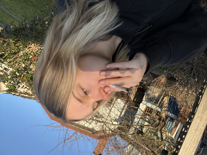 A young adult with light blonde hair is seen smoking a cigarette, held in their fingers near their face
