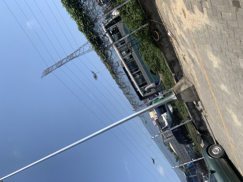 The scene depicts an outdoor urban or semi-urban environment in Igboefon, Nigeria, under a clear, bright blue sky with minimal cloud cover. In the immediate foreground, a paved surface composed of grey interlocking bricks is visible, traversed by a thin, faded yellow painted line. Scattered light-colored debris or sand lies across this paved area. A dark green vehicle, consistent with a sedan, is partially visible on the lower left, showing its front left wheel and a section of the hood. A tall, slender silver-colored pole, likely a utility pole or streetlight support, rises from a concrete base in the left-mid foreground. Midground elements include a chain-link fence running horizontally across the image, adorned with green climbing vines and foliage. Behind this fence is a dense strip of green bushes and vegetation. Beyond the vegetation and fence, a light blue and white passenger bus is visible, exhibiting signs of wear. To the left of the bus, a single individual is discernible, wearing a light-colored patterned shirt, blue trousers, and a green head covering, facing away from the camera. Other vehicles, including a white truck, are partially visible in the distance beyond the bus. Several poles equipped with what appear to be solar-powered streetlights are spaced throughout the midground. The background is dominated by a large, multi-section metal lattice transmission tower, positioned on the right side of the frame and extending diagonally upwards. Multiple parallel power lines are stretched across the sky, traversing the upper portion of the image.