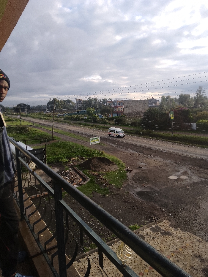 The image presents an elevated, wide-angle view of a semi-urban environment within Njoro ward, Kenya, under an overcast sky. In the immediate foreground, the left side is occupied by the partial figure of an individual, from the chest up, wearing a dark beanie with a colorful pattern and a dark garment, possibly a jacket or shirt. A strap is visible over their left shoulder. The person's face is turned towards the camera. A dark, ornate metal balcony railing extends across the lower portion of the frame. Below the railing, hexagonal paving stones are visible, some appearing damp or stained, along with a translucent, coiled object on the right side. The midground features an unpaved, two-lane road with visible ruts and standing water, indicating recent moisture. A white passenger van, typical of a matatu, travels on the road from right to left. Wooden utility poles with multiple power lines run parallel to the road. To the left of the road, a small, light-colored sign with the text "SUKAKA SUPERMARKET" is posted adjacent to a pile of disturbed earth and debris. Green grass and scattered vegetation flank the road. Another distant vehicle is faintly visible further along the road. The background reveals a mix of sparse trees and various buildings, including multi-story structures under construction or incomplete, characterized by visible concrete blocks. Other structures appear to be painted residences or commercial establishments. The horizon is defined by a dense line of trees. The sky is predominantly covered by grey, stratiform clouds, suggesting an overcast condition.