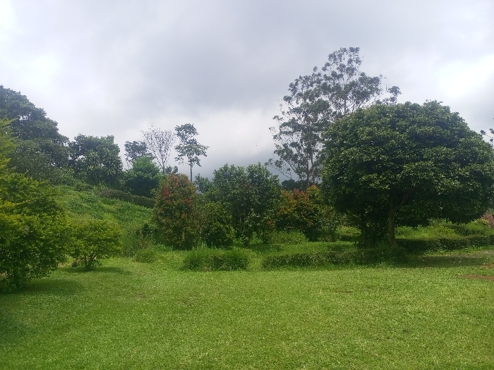 The image displays a verdant outdoor landscape in Ciherang, Indonesia, under an overcast sky. The foreground is dominated by a neatly mowed, bright green lawn, occupying approximately the lower half of the frame, free of any visible subjects or objects. Transitioning into the midground, the terrain gently rises, featuring taller, unkempt grass and a variety of trees and shrubs. A prominent, large tree with a dense, rounded green canopy stands towards the right of the midground, casting a faint shadow on the grass. To its left, smaller, bushy green trees and a shrub with reddish foliage are discernible. The background consists of a densely vegetated hillside, with numerous trees of varying heights and leaf densities, some appearing taller and more slender against the sky. The sky is uniformly light grey and cloudy, indicating diffused lighting conditions. No people, animals, man-made structures, or actions are present in the scene.