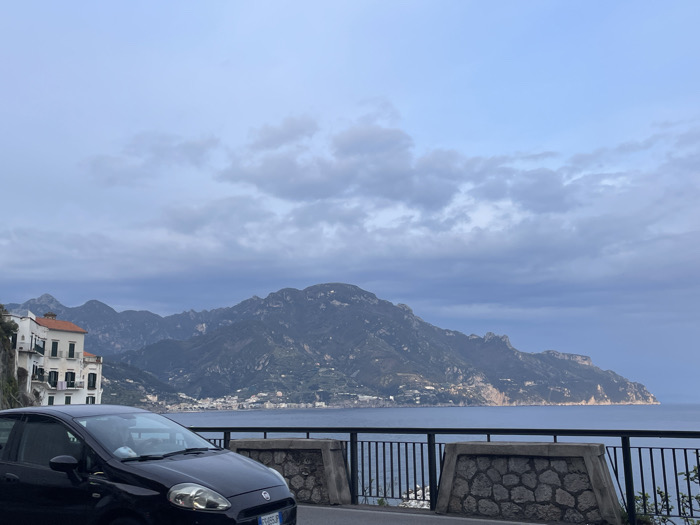 The image depicts a coastal scene in Pogerola, Italy, under an overcast sky. In the foreground, a dark-colored Fiat Punto automobile is partially visible on the left, parked on a paved road. An Italian license plate is present on the vehicle. A black metal railing with stone-faced support structures runs along the road's edge, overlooking the sea. The midground features the calm, blue Tyrrhenian Sea, which meets a rugged coastline characterized by steep, green-covered mountains. Clusters of white and light-colored buildings with red-tiled roofs are visible along the lower mountain slopes and directly on the coastline. On the far left, a multi-story white building with balconies is prominent, built into the hillside. The background consists of distant mountain ranges and a sky dominated by light blue and grey clouds. No individuals or specific actions are discernible.