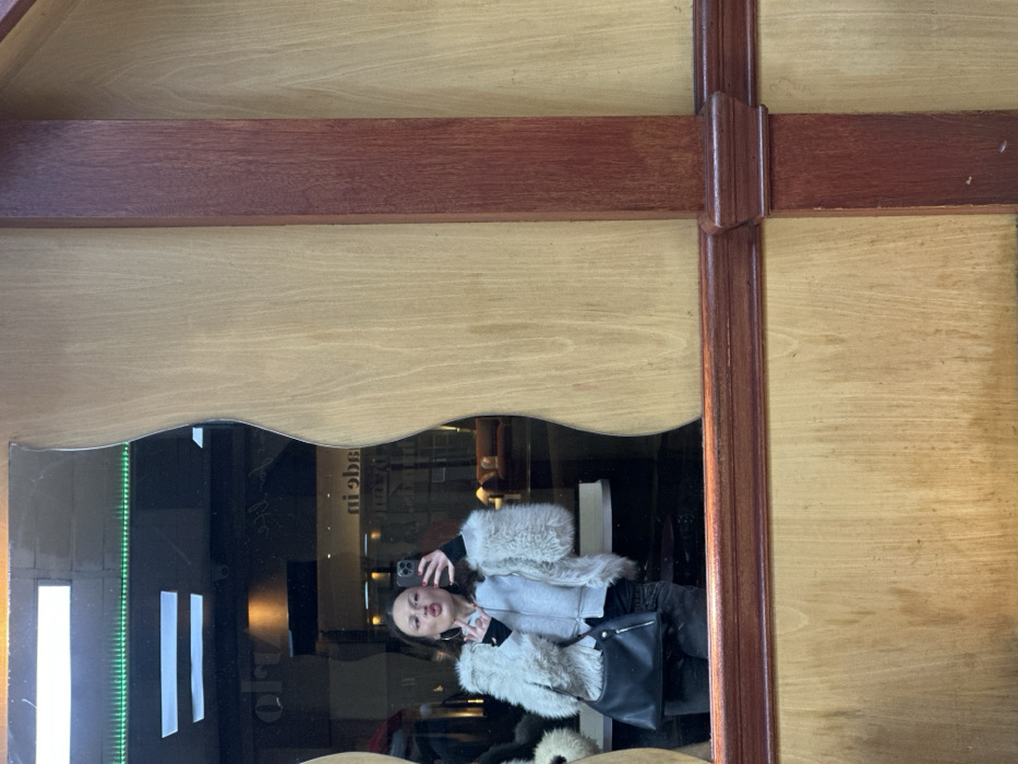 A mirror framed with dark wood reflects an interior scene. A person in a light-colored, furry jacket holds a phone, capturing a selfie. The reflection shows a dimly lit space, possibly a restaurant or store, with chairs and writing visible on the glass. The mirror's edge has a decorative, wavy shape. The surrounding wooden frame consists of horizontal and vertical pieces with a cross-shaped intersection. The dominant colors are brown, beige, gray, and black.