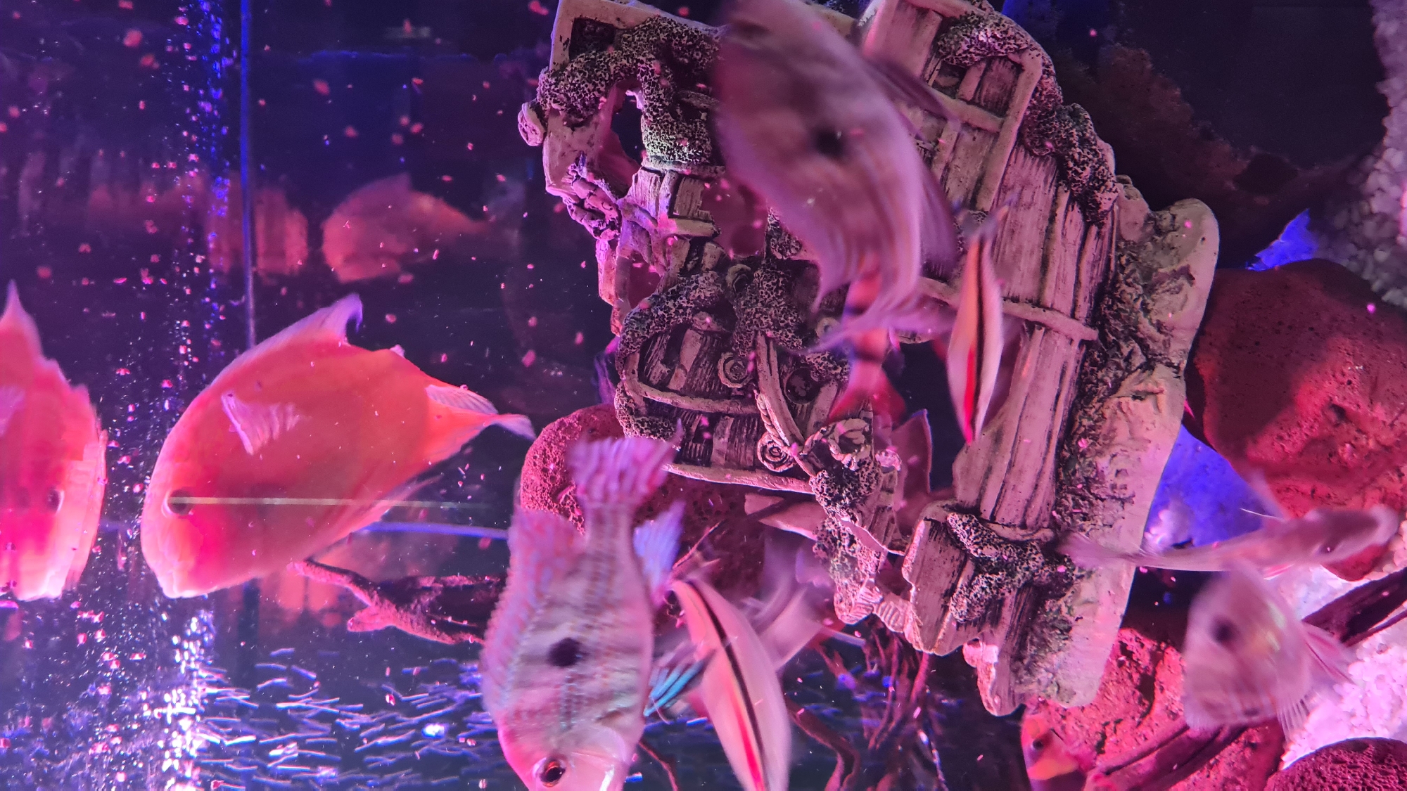 An illuminated aquarium scene, located in the Lachish Regional Council, Israel, is depicted. The primary feature is a large, beige-colored artificial shipwreck decoration situated prominently in the center-right, textured to resemble distressed wood and covered in barnacle-like growths. The tank floor consists of light-colored gravel and scattered reddish-brown rocks. Multiple fish are present, moving through the water. Two large, broad-bodied fish, appearing orange-pink due to the lighting, swim in the upper half of the tank, with one clearly visible in the top-center and another reflected or further back. A silver-bodied fish with a distinct black spot and horizontal stripes is visible in the mid-ground, positioned to the left of the shipwreck. Several other smaller, striped fish are captured in motion blur throughout the tank, particularly in the lower and right portions. The water contains numerous pinkish particulate matter, consistent with suspended food or debris, and a stream of air bubbles is visible along the left tank wall. The entire environment is illuminated by strong artificial pink, purple, and blue lighting.