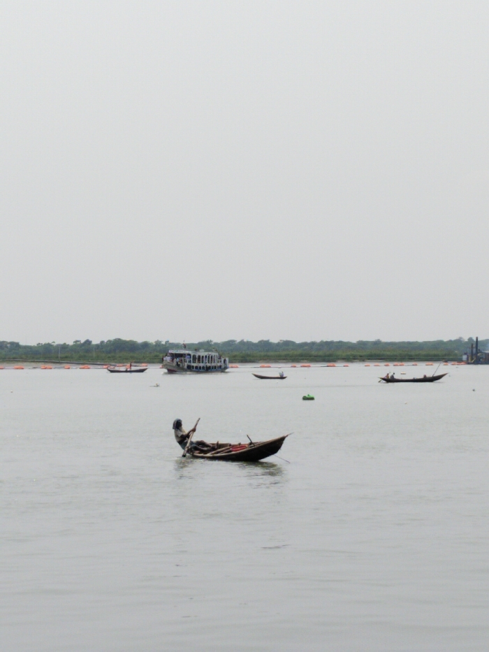 A man rows a wooden boat in a river in Pangasia, Bangladesh. There are two other small boats and a larger ferry in the background. The river is wide and calm. The sky is overcast and there are trees visible on the far shore. The scene is located at latitude: 22.704, longitude: 90.565.