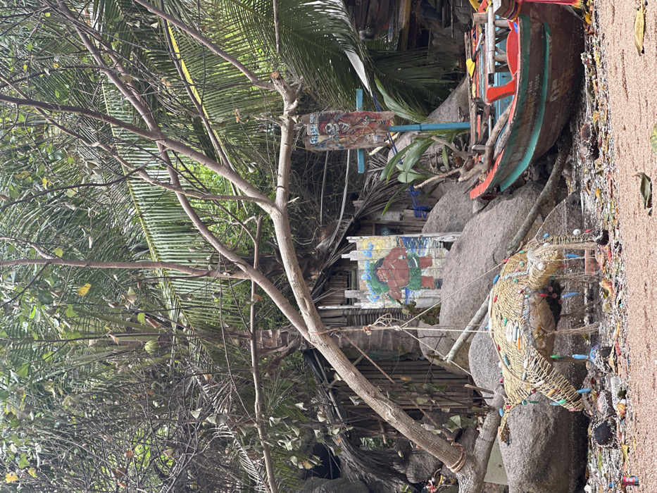A tropical scene featuring lush greenery and a scattering of man-made elements. A leaning tree dominates the foreground, with a backdrop of palm fronds. In the background, there is a hut-like structure adorned with a large painted face and various signs. An old boat sits on the shore nearby. The beach is covered in pebbles, shells, and colorful debris.
