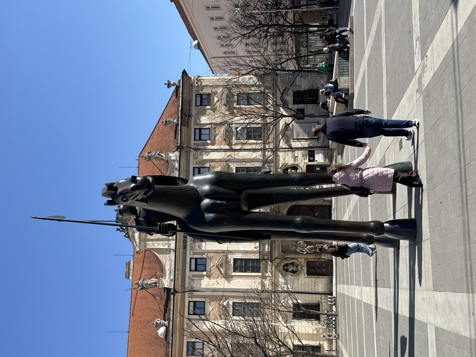 The image depicts a daytime scene on Moravian Square (Moravské náměstí) in Brno, Czechia. In the foreground and central to the image is the large, dark bronze equestrian statue known as "Jošt" or the "Moravian Gentry." The statue features a stylized knight on a horse with elongated legs, holding a spear vertically. The horse's head is distinctively designed with prominent, round eyes, facing left. Behind the statue stands the Governor's Palace (Místodržitelký palác), which houses the Moravian Gallery. This multi-story Baroque-style building has a reddish-brown tiled roof, numerous rectangular windows, and an ornate, weathered facade with visible signs of age and plaster decay. Sculptural figures adorn the roofline and upper architectural elements. The letters "MOR" from "MORAVSKÁ GALERIE" are partially visible on its front. To the right of the palace, another multi-story building with a lighter facade is visible. The square is paved with a grid pattern of light and dark gray square tiles. Bare deciduous trees are scattered throughout the square, suggesting late winter or early spring. The sky is clear and bright blue. Several individuals are present. In the immediate foreground, a couple walks away from the viewer, holding hands. The woman wears a light pink quilted coat and dark trousers, carrying a black backpack. The man wears a dark blue hoodie, blue jeans, and white athletic shoes. Their shadows are cast long on the paving. To their left, another person in a brown jacket and blue jeans walks away. Further in the background, on the right side of the square, a group of people is seated on a low stone structure, possibly a fountain or bench, while others walk in the distance. Bicycles are visible parked near the left edge of the frame.